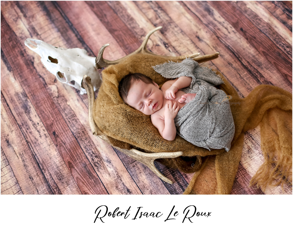 Candice Dollery photographed baby Robert against the Rustic Wooden Floor photo backdrop.